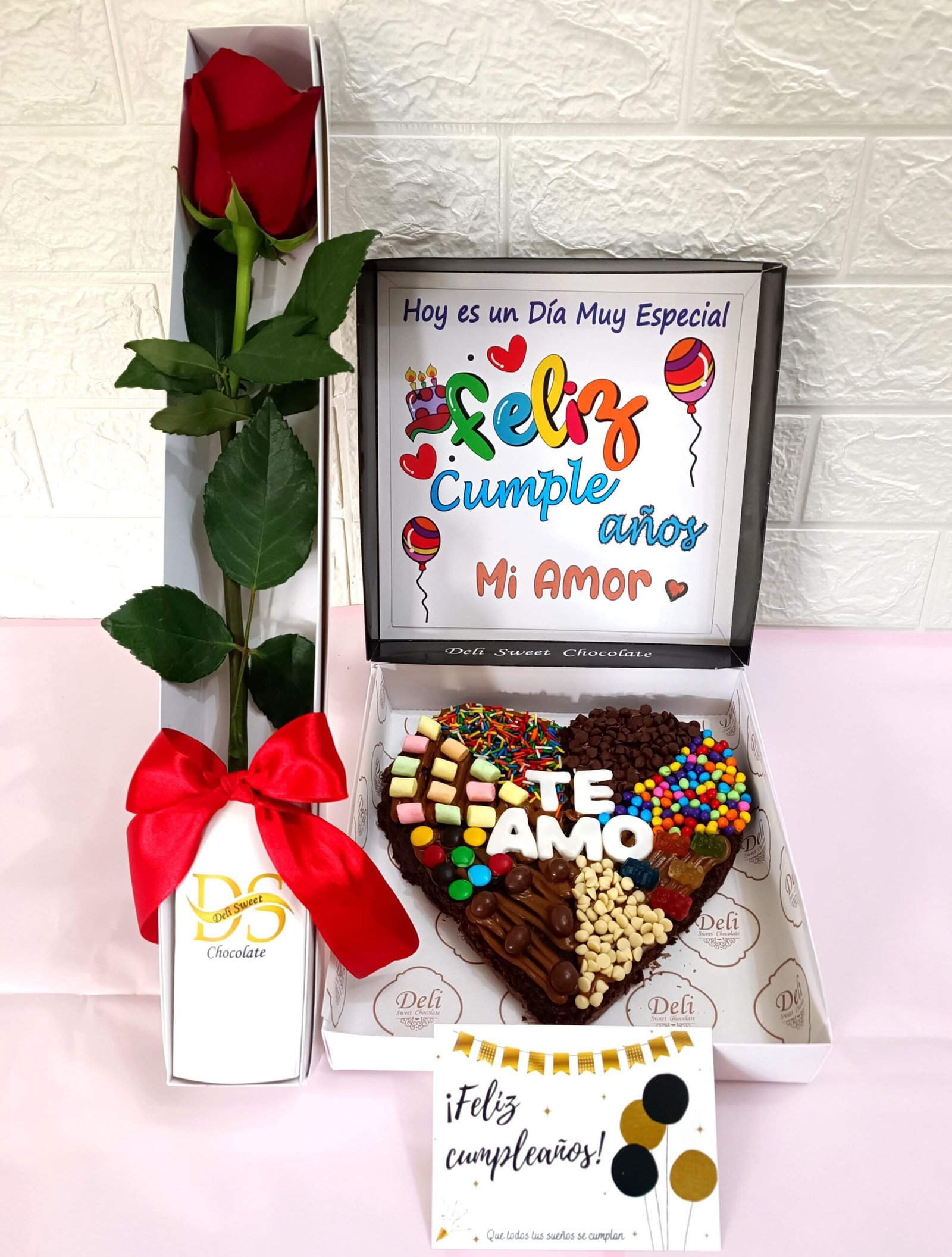 Brownie Corazon Cumpleaños con Caja de 1 Rosa Natural