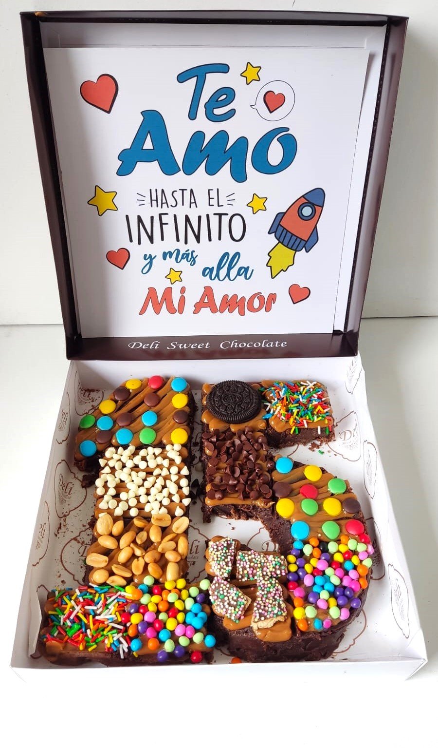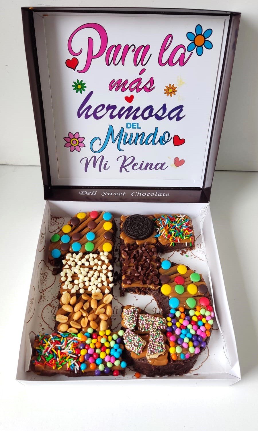 – Un Brownie de 2 Números o Letras cubierto con manjar y fudge, decorado con diferentes toppings